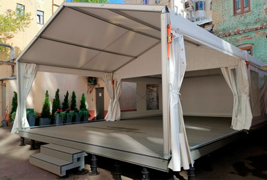 Сборно-разборная конструкция на основе алюминиевого профиля позволяет в очень короткие сроки (от 4 часов) смонтировать конструкцию на любой ровной поверхности.