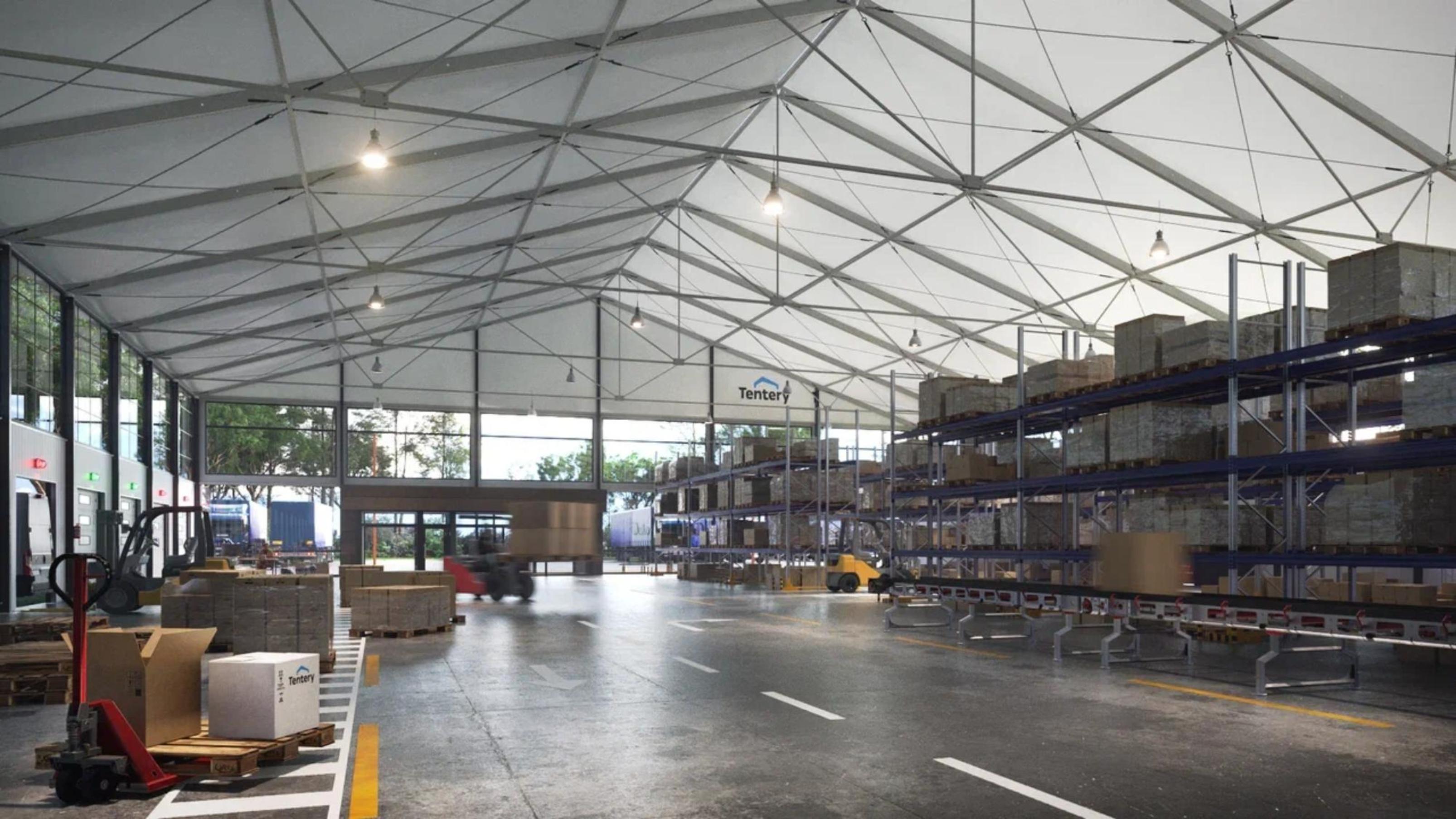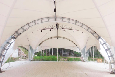 Модульное устройство каркасно-тентовой конструкции позволяется увеличивать количество пролётов на месте для укрытия любой площади без ограничения по длине. Ширина пролёта до 50 метров.